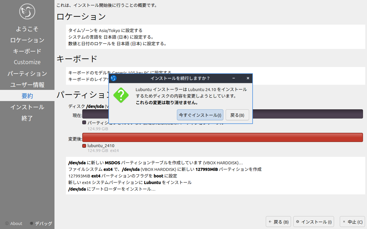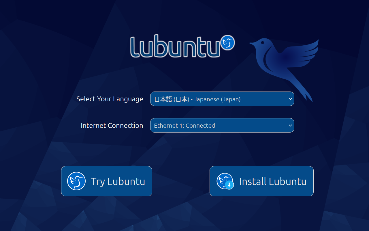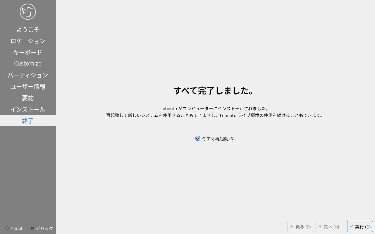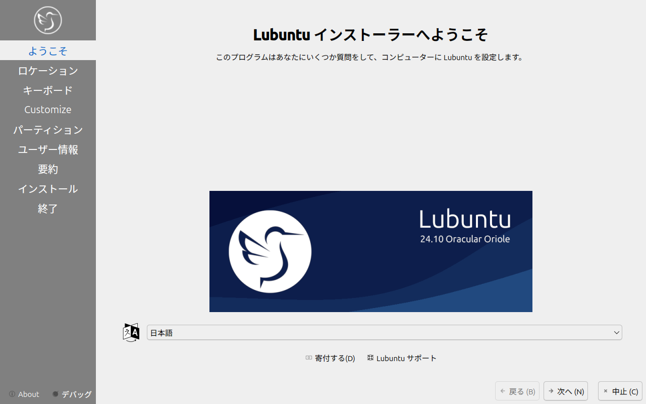 他の「Ubuntu」系のディストリビューションは、いきなりインストーラが起動しますが、「Lubuntu」では、インストーラは、手動で起動します。
