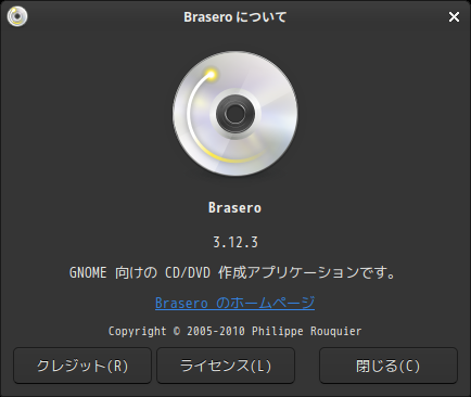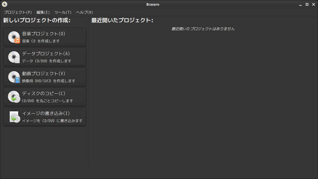 起動直後の状態です。 2024年10月16日の時点で、下記のバージョンでした。 操作方法等については、「デスクトップ環境構築 - 共通事項 - 光ディスクライティング」をご参照ください。 |