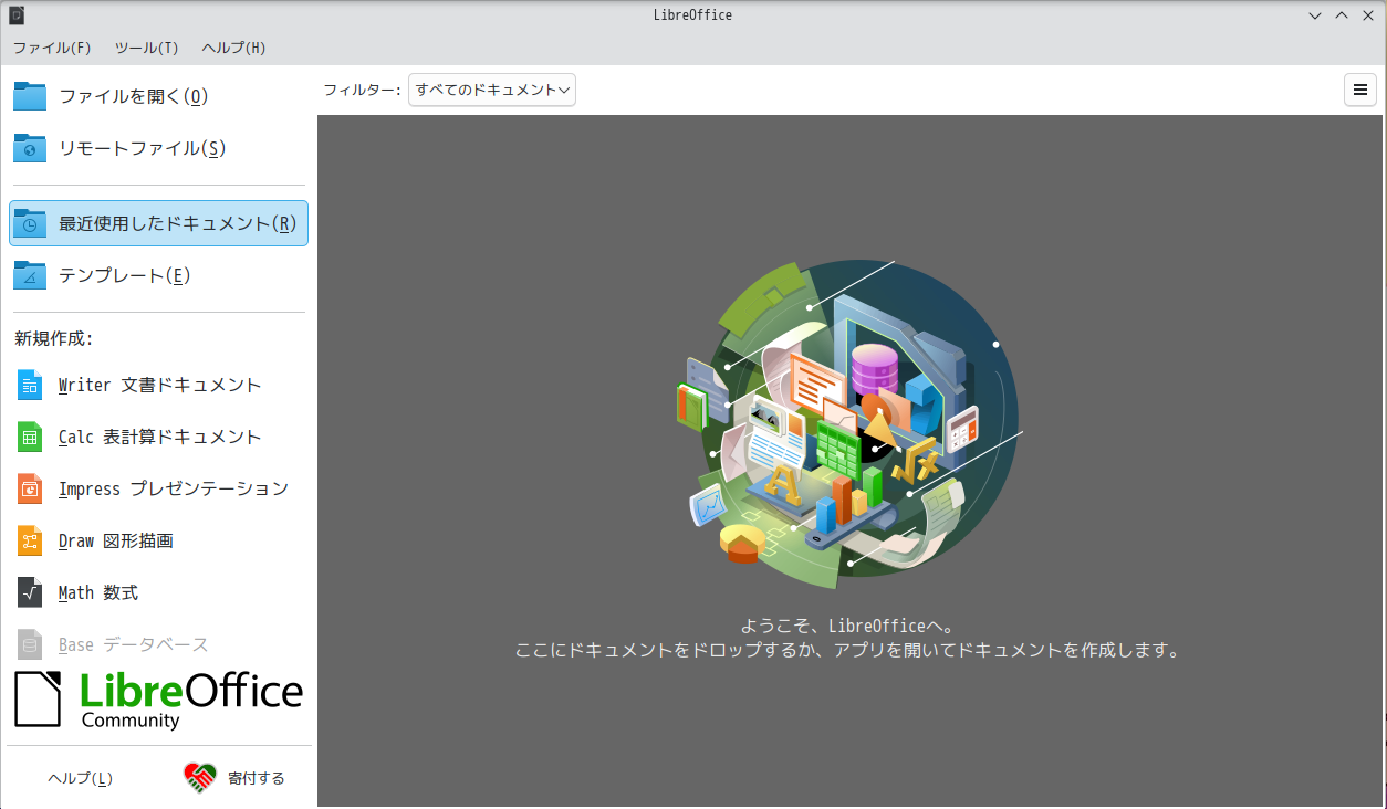 1. 概要 オフィススイートとして、「LibreOffice」を使用します。 前回は、日本語化されていませんでしたが、今回は、日本語化されていました。 2. 起動 「スタート」→「オフィス」→「LibreOffice」