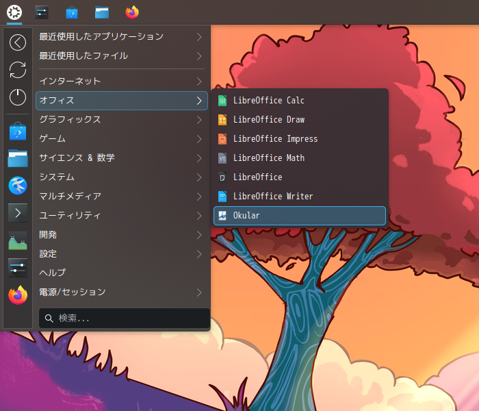 1. 概要 ドキュメントビューアとして、「Okular」を使用します。 「Okular」は、デフォルトでインストールされています。 2. 起動 「スタート」→「オフィス」→「Okular」