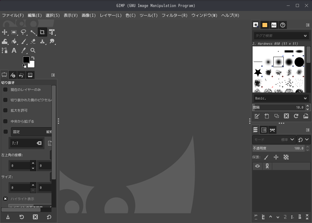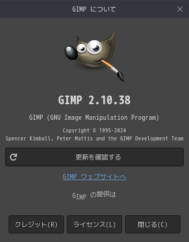 起動直後の状態です。 2024年10月16日の時点で、下記のバージョンでした。 操作については、「画像編集ソフト GIMP2」に掲載しています。 上記は簡単なものですので、詳細なものがほしい方は、各所に初歩の手引きから応用編までありますので、そちらを参考にしてください。 |