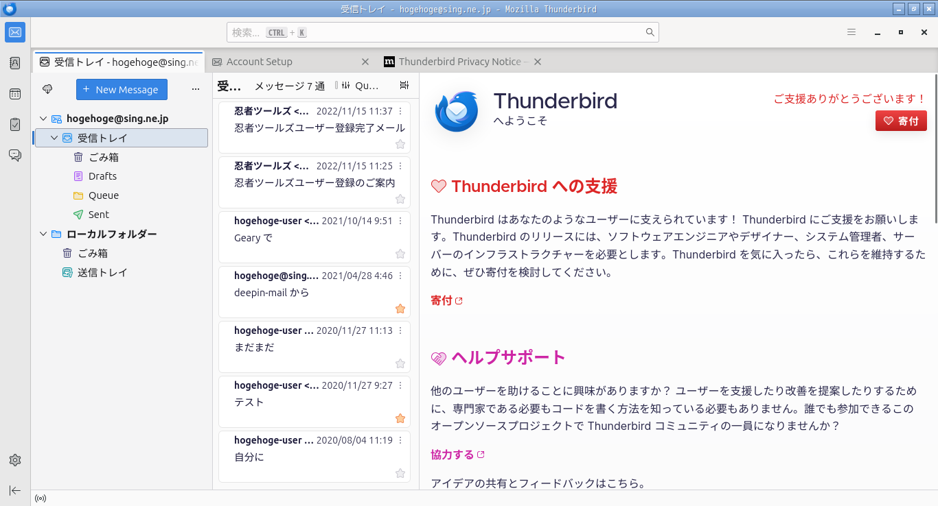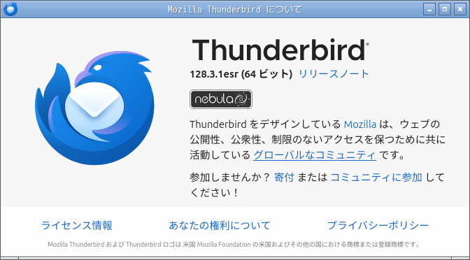 初回起動時は、メールアカウント設定が起動します。 起動直後に、受信トレイを開いた状態です。 2024年10月17日の時点で、下記のバージョンでした。 メールアカウント設定・他、操作方法については「メールクライアント - Thunderbird」をご参照ください。 |