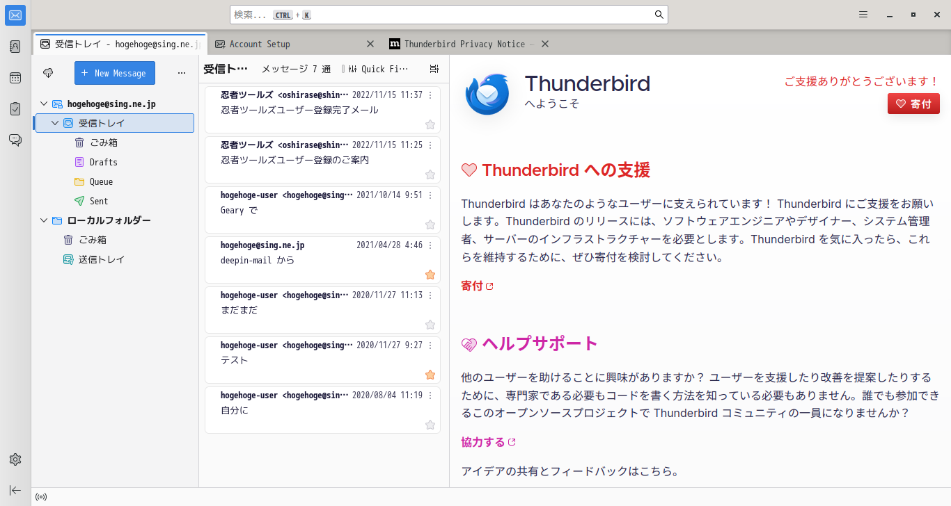 初回起動時は、「アカウントセットアップ」から起動します。 起動後、受信トレイを開いた状態です。 2024年10月18日の時点で、下記のバージョンでした。 |