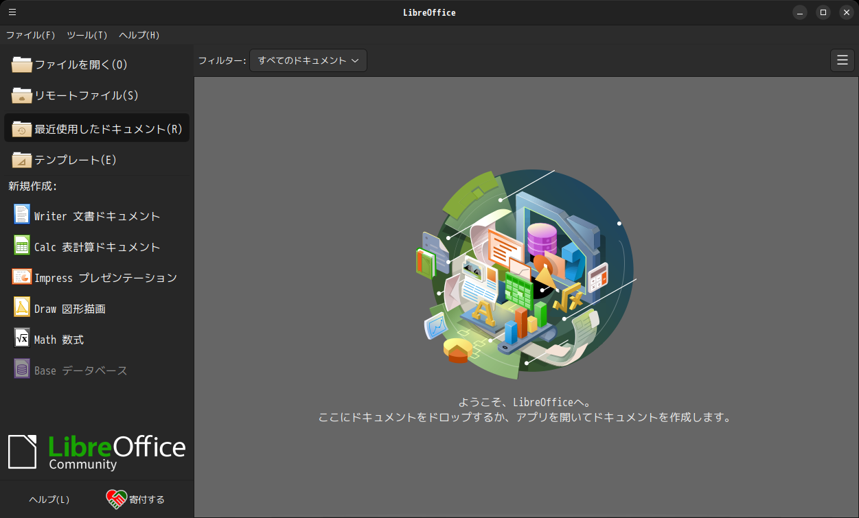 1. 概要 オフィススイートとして、「LibreOffice」を使用します。 「LibreOffice」は、デフォルトでインストールされ、日本語化されています。 2. 起動 「スタート」→「オフィス」→「LibreOffice」