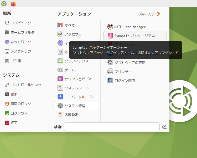 「スタート」→「システム管理」→「Synaptic パッケージマネージャ」
