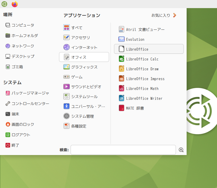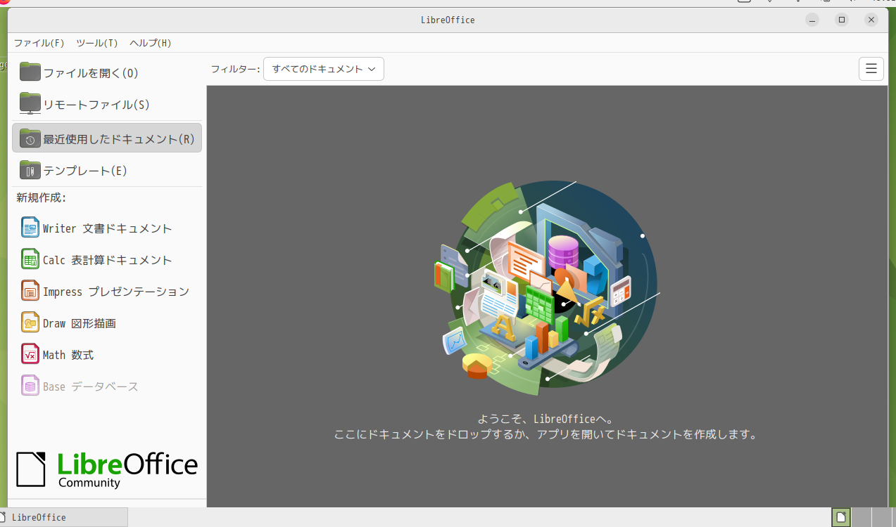 1. 概要 オフィススイートとして、「LibreOffice」を使用します。 「LibreOffice」はデフォルトでインストールされており、日本語化されています。 2. 起動 「スタート」→「オフィス」→「LibreOffice」