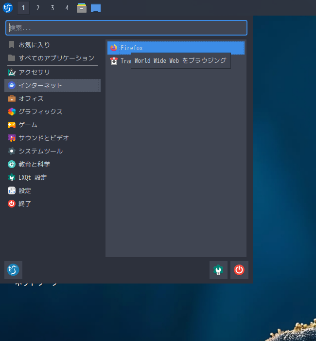 1. 概要 ブラウザとして、デフォルトで「Firefox」がインストールされており、日本語化されています。 操作手順等については、「ブラウザ - Firefox - 日本語化」をご参照ください。 2. 起動 「スタート」→「インターネット」→「Firefox」