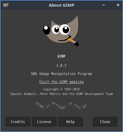 起動直後の状態です。 日本語化されていませんが、なんとか使えるかと思います。 2025年5月2日の時点で、下記のバージョンでした。 「Arch Linux」系は、「GIMP2」から「GIMP3」へ移行したようですが、「Ubuntu」も移行したようです。 操作については、「画像編集ソフト GIMP2」に掲載しています。 上記は簡単なものですので、詳細なものがほしい方は、各所に初歩の手引きから応用編までありますので、そちらを参考にしてください。 |