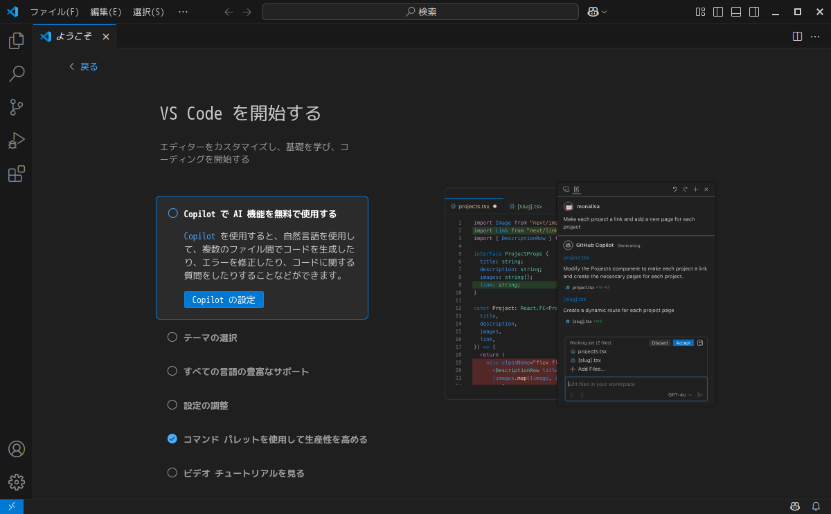 1. 概要 開発環境として、「Visual Studio Code」を使用します。 2. インストール 「アプリセンター」で、「vscode」を検索して、インストールします。 3. 起動 「スタート」→「開発」→「Visual Studio Code」