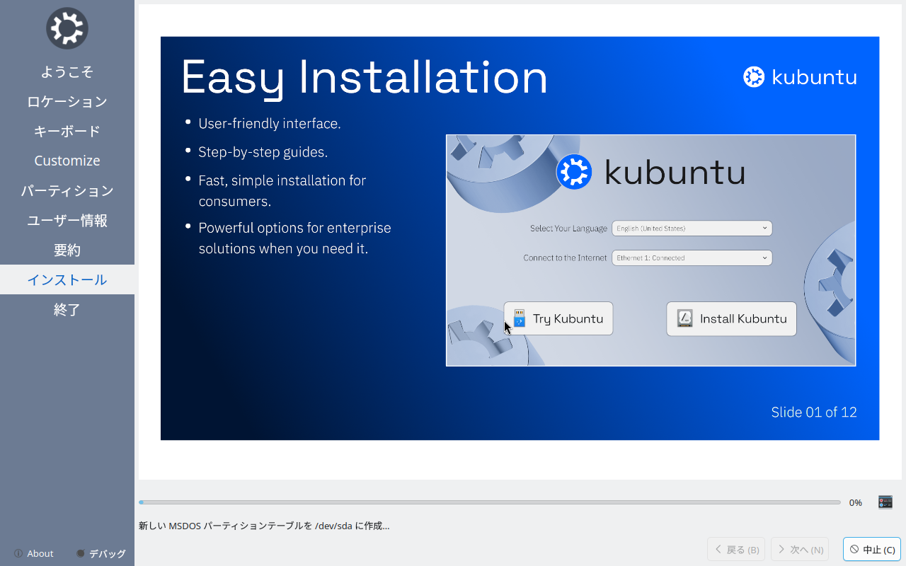 「Kubuntu」は、「Lubuntu」と同様、インストール時の見た目が、いささか他のディストリビューションと異なるので、インストール手順を別途記述します。