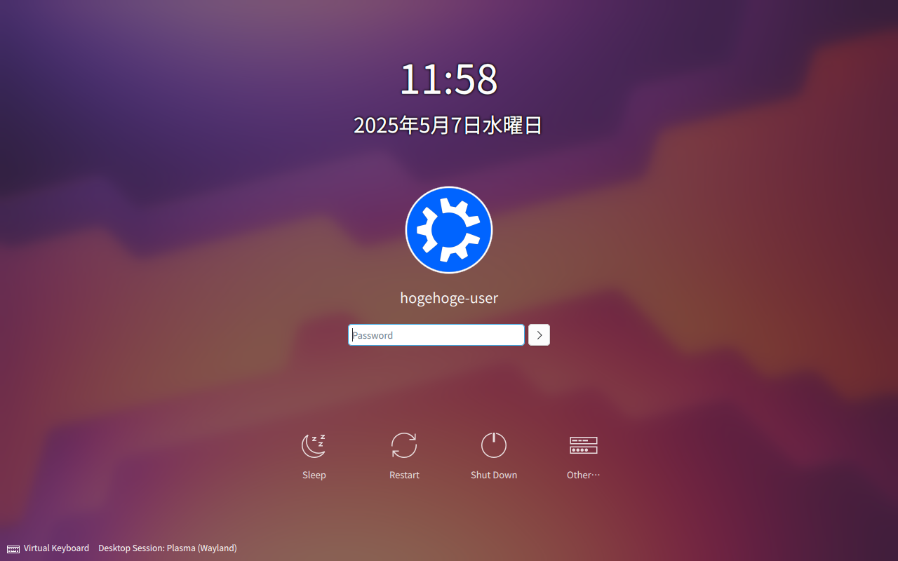 セッションに、「Wayland」と「X11」がありますが、「VirtualBox」上へインストールしている場合は、「X11」の方へログインします。