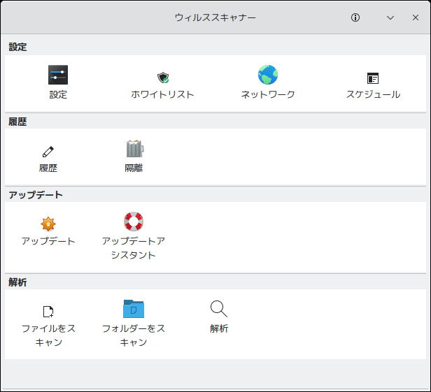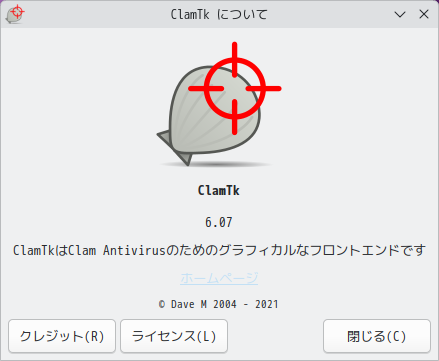 起動直後の状態です。 2025年5月7日の時点で、下記のバージョンでした。 操作方法については、「FreeBSD」のものですが「FreeBSD - デスクトップ環境構築 - 共通事項 - ClamTk」をご参照ください。 |