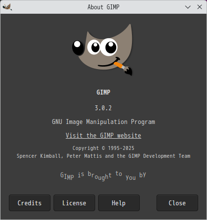 起動直後の状態です。 日本語化されていませんが、なんとか使えるかと思います。 2025年5月7日の時点で、下記のバージョンでした。 「Arch Linux」系は、「GIMP2」から「GIMP3」へ移行したようですが、「Ubuntu」も移行したようです。 操作については、「画像編集ソフト GIMP2」に掲載しています。 上記は簡単なものですので、詳細なものがほしい方は、各所に初歩の手引きから応用編までありますので、そちらを参考にしてください。 |