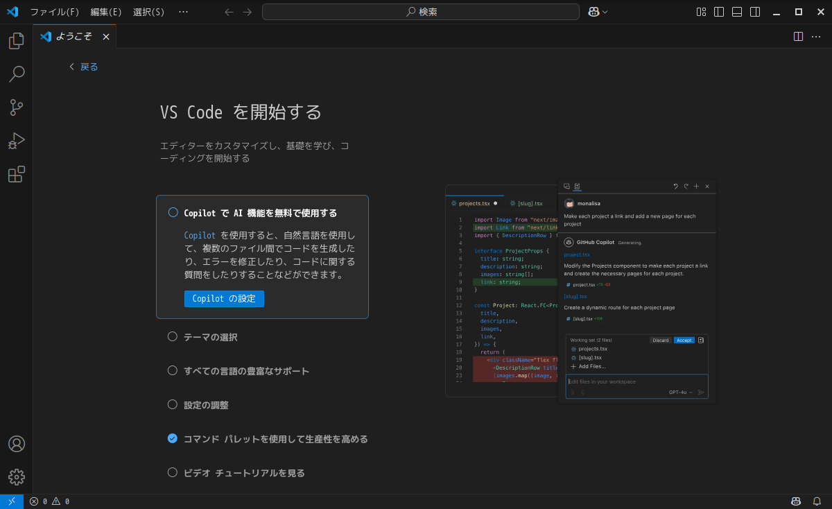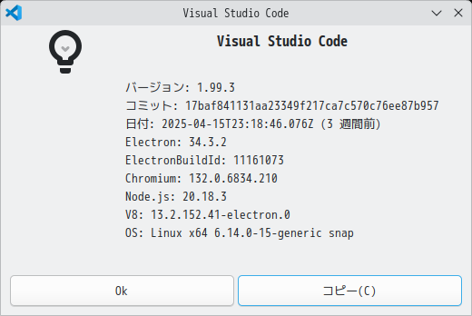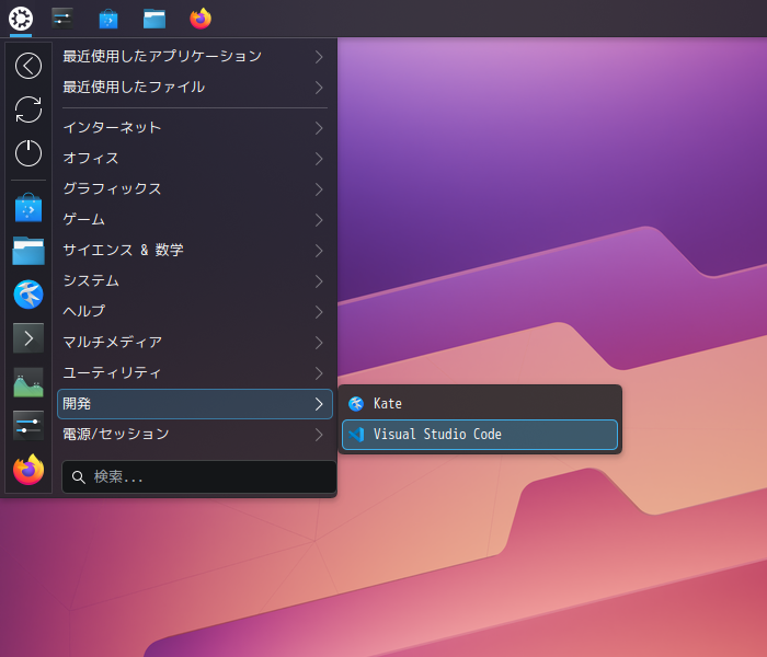 1. 概要 開発環境として、「Visual Studio Code」を使用します。 2. インストール 「Discover」で、「vsocde」を検索して、「code」をインストールします。 3. 起動 「スタート」→「開発」→「Visual Studio Code」
