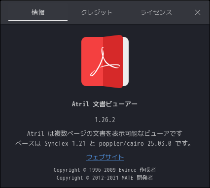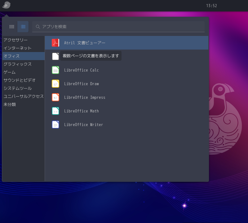 ドキュメントビューアとして、「Atril」を使用します。  「Atril」は、デフォルトでインストールされています。