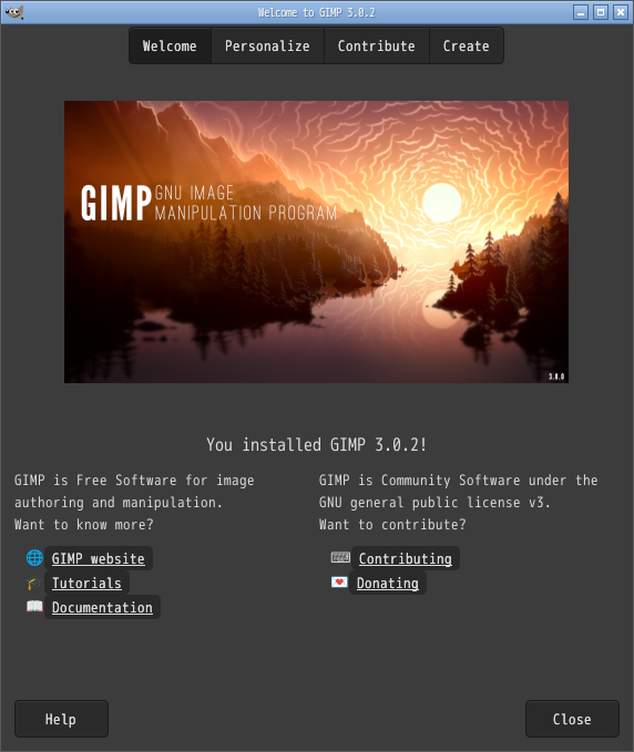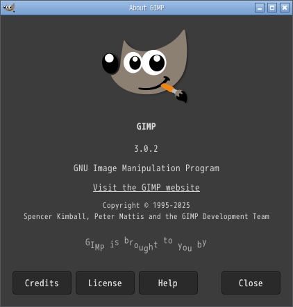 「Close」 起動直後の状態です。 日本語化されていませんが、なんとか使えるかと思います。 2025年5月9日の時点で、下記のバージョンでした。 「Arch Linux」系は、「GIMP2」から「GIMP3」へ移行したようですが、「Ubuntu」も移行したようです。 操作については、「画像編集ソフト GIMP2」に掲載しています。 上記は簡単なものですので、詳細なものがほしい方は、各所に初歩の手引きから応用編までありますので、そちらを参考にしてください。 |