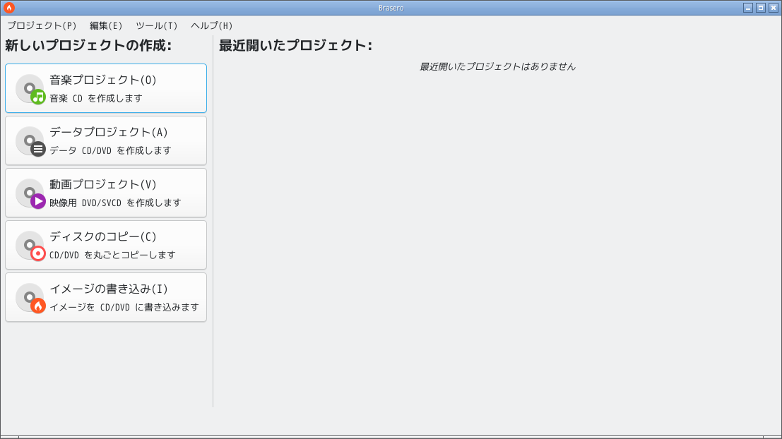 1. 概要 光ディスクのライティングソフトとして「Brasero」を使用します。 2. インストール 「Synaptic」で、「brasero」を検索して、インストールします。 3. 起動 「スタート」→「マルチメディア」→「Brasero」