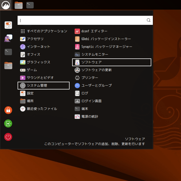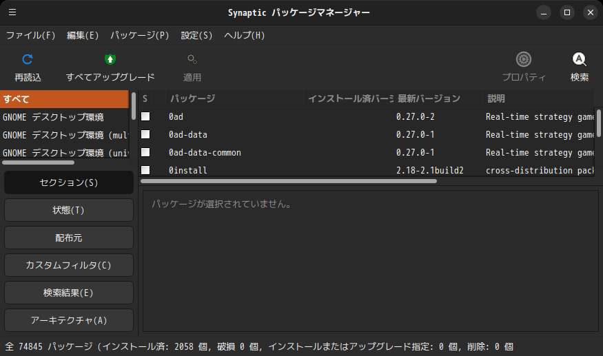 パッケージ管理の「GUI」フロントエンドとして、「ソフトウェア(gnome-software)」と「Synaptic パッケージマネージャ」を使用します。