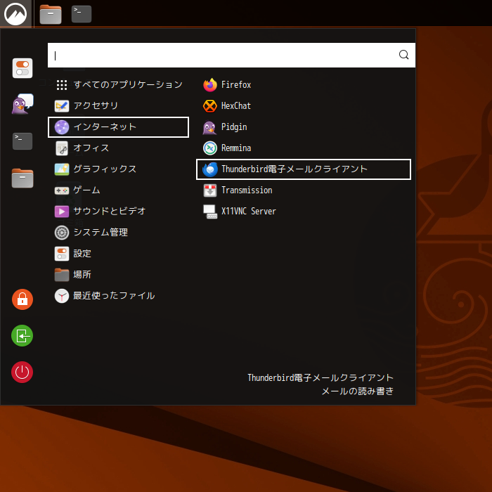 1. 概要 メールクライアントとして、「Thunderbird」がインストールされ、日本語化されています。 「Thunderbird」の「アカウントセットアップ」その他に関しては、「メールクライアント - Thunderbird」をご参照ください。 2. 起動 「スタート」→「インターネット」→「Thunderbird」