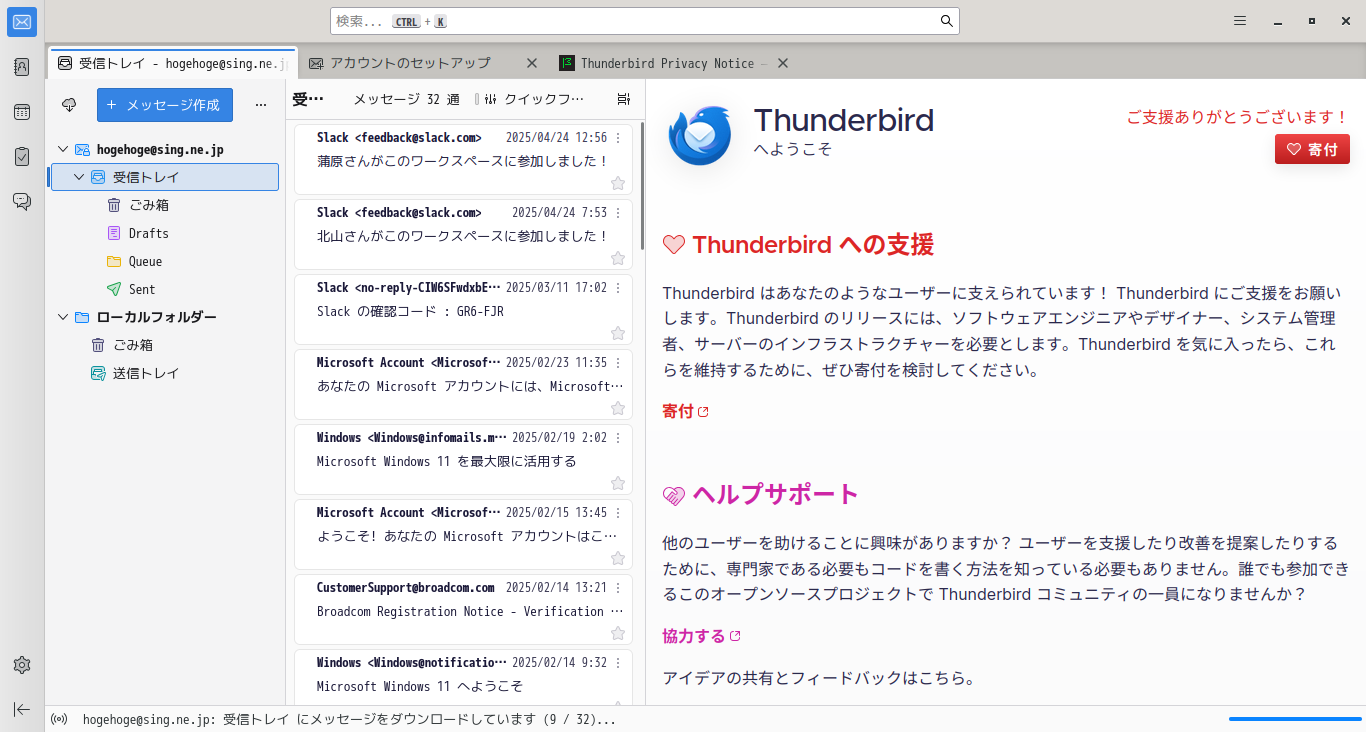 起動後、受信トレイを開いた状態です。