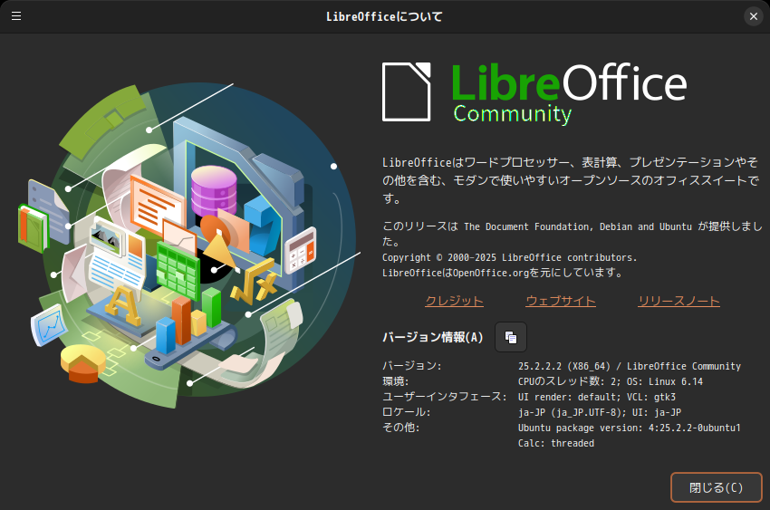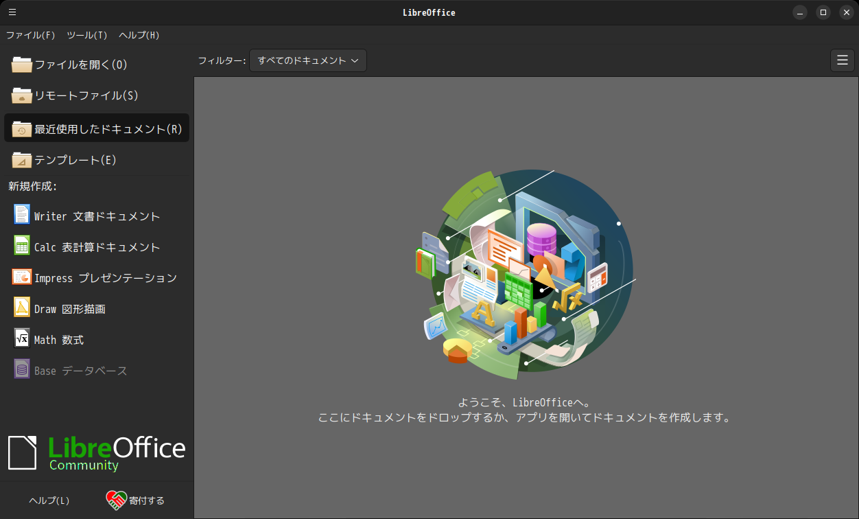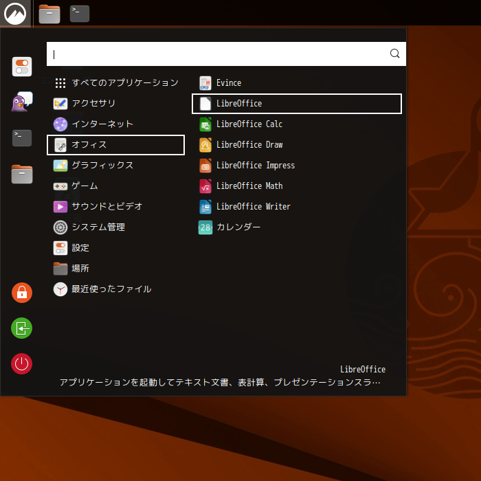 1. 概要 オフィススイートとして、「LibreOffice」を使用します。 「LibreOffice」は、デフォルトでインストールされ、日本語化されています。 2. 起動 「スタート」→「オフィス」→「LibreOffice」