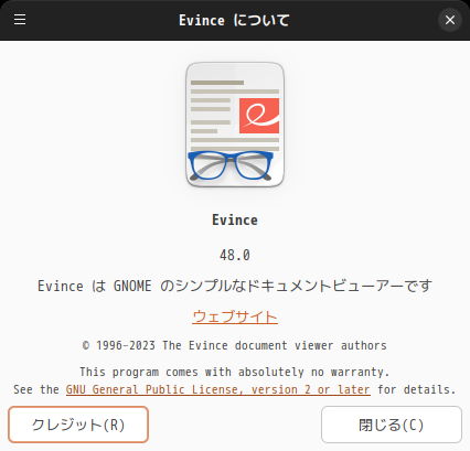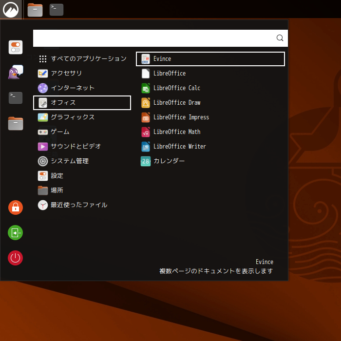 ドキュメントビューアとして、「Evince」を使用します。  「Evince」はデフォルトでインストールされています。
