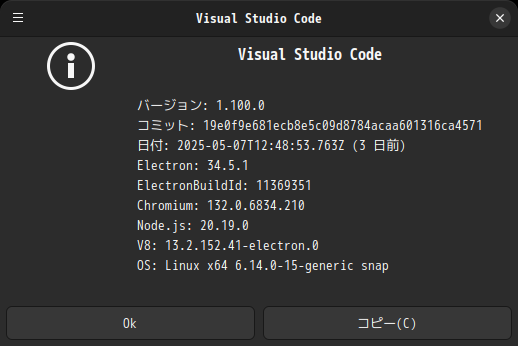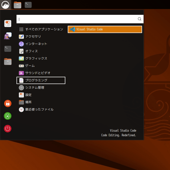 1. 概要 開発環境として、「Visual Studio Code」を使用します。 2. インストール 「ソフトウェア(gnome-software)」で「vscode」を検索して、「code」をインストールします。 3. 起動 「スタート」→「プログラミング」→「Visual Studio Code」