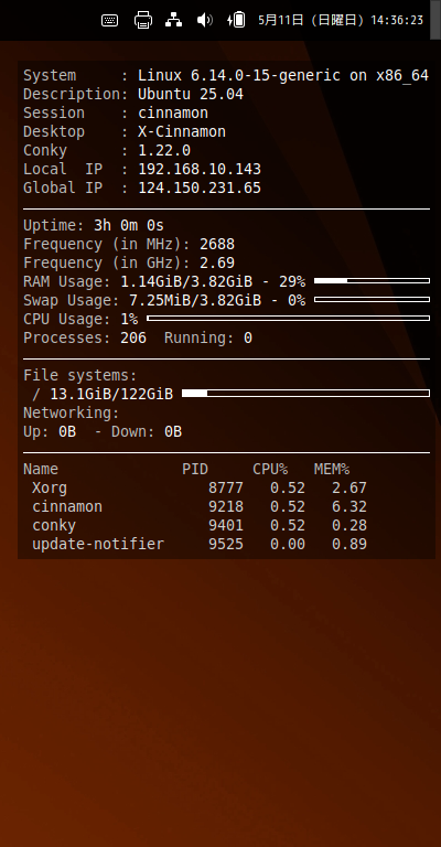ログイン後に、デスクトップ右に、「Conky」の表示が現れます。