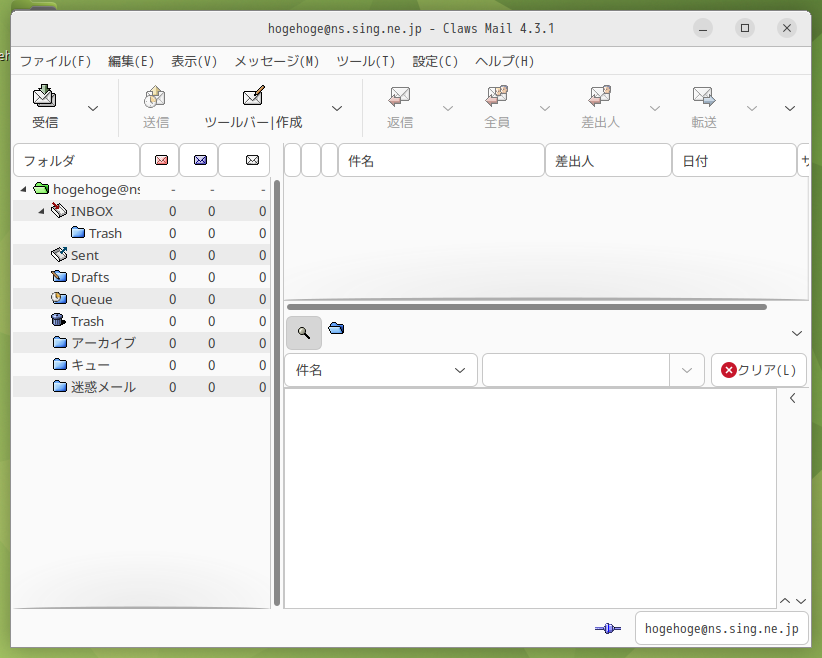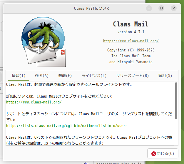 1. 概要 メールクライアントとして、インストールされているものはありません。 「Claws Mail」をインストールして使用します。 設定ウィザード等、操作に関しては、「メール クライアント ソフト - Claws Mail」をご参照ください。 2. インストール 「Synaptic」で、「claws-mail」を検索して、インストールします。 3. 起動 「スタート」→「オフィス」→「Claws Mail」