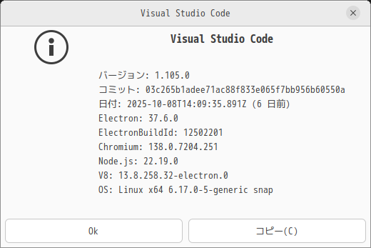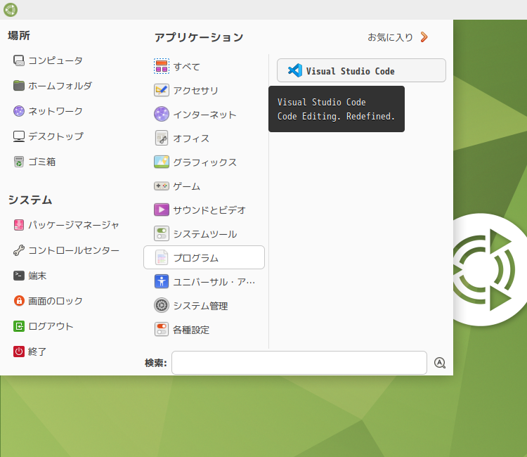 1. 概要 開発環境として、「Visual Studio Code」を使用します。 2. インストール アプリセンター「snap-store」で、「Visual Studio Code」を検索して、青い方をインストールします。 3. 起動 「スタート」→「プログラム」→「Visual Studio Code」