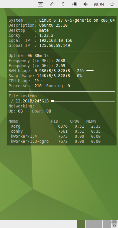 ログイン後に、デスクトップ右に、「Conky」の表示が現れます。