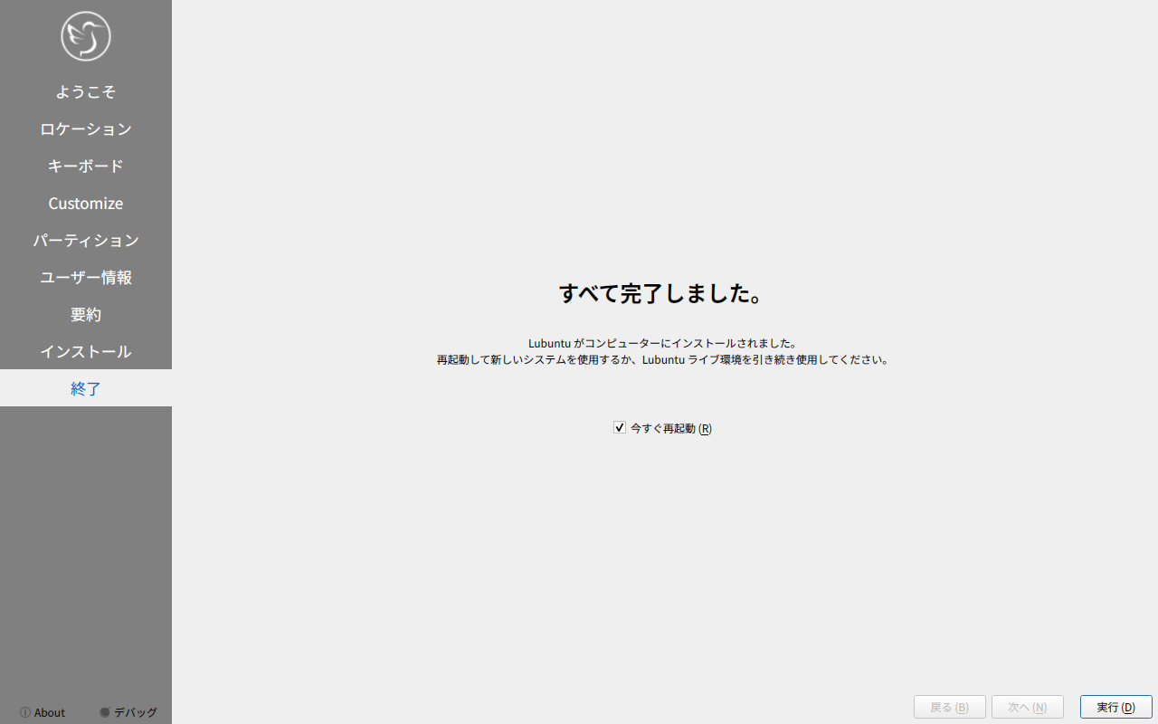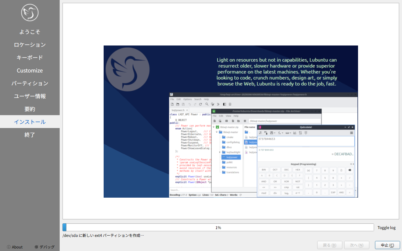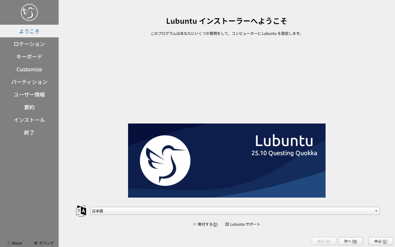 他の「Ubuntu」系のディストリビューションは、いきなりインストーラが起動しますが、「Lubuntu」では、インストーラは、手動で起動します。