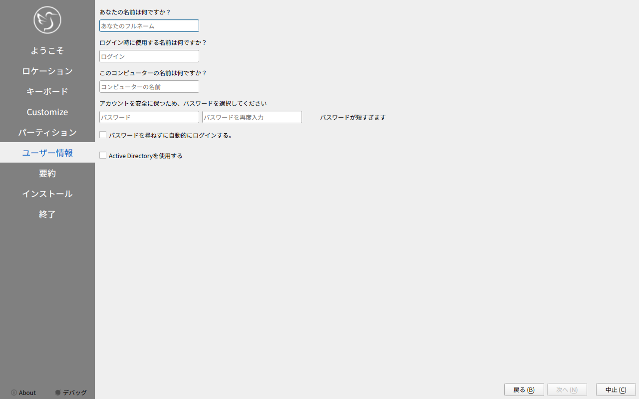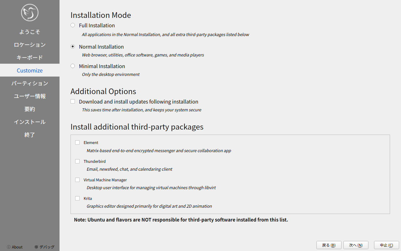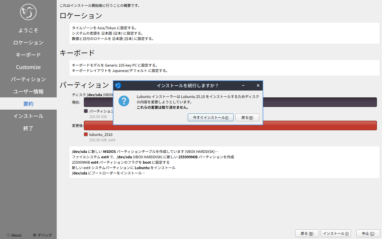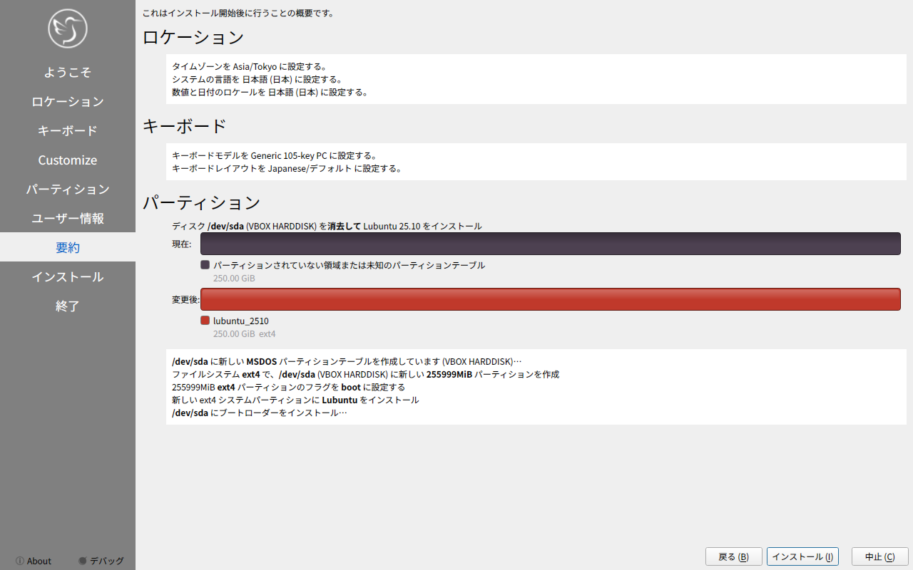 他の「Ubuntu」系のディストリビューションは、いきなりインストーラが起動しますが、「Lubuntu」では、インストーラは、手動で起動します。
