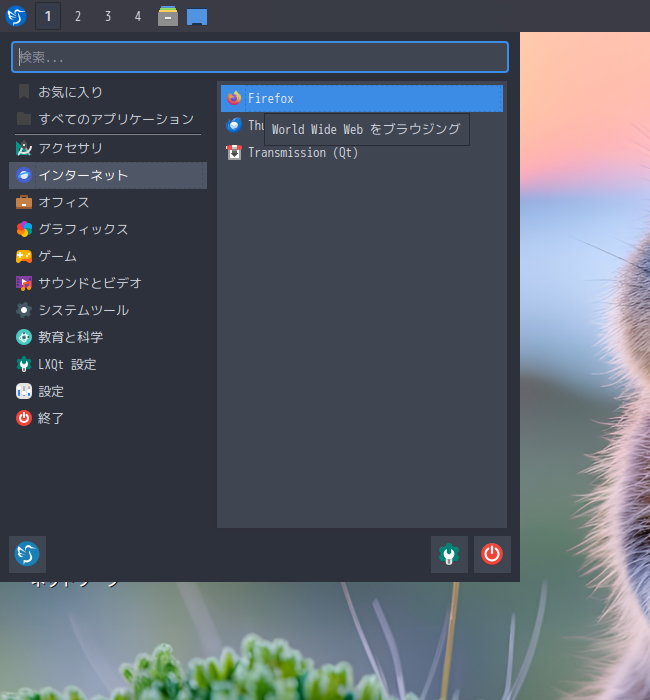 1. 概要 ブラウザとして、デフォルトで「Firefox」がインストールされており、日本語化されています。 操作手順等については、「ブラウザ - Firefox - 日本語化」をご参照ください。 2. 起動 「スタート」→「インターネット」→「Firefox」