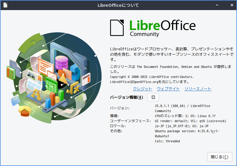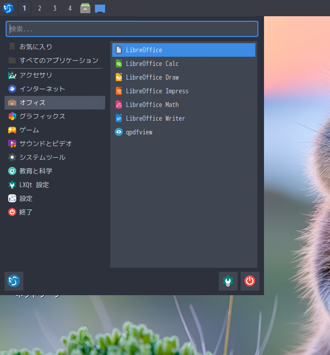 1. 概要 オフィススイートとして、「LibreOffice」を使用します。 「LibreOffice」は、デフォルトでインストール・日本語化、されています。 2. 起動 「スタート」→「オフィス」→「LibreOffice」