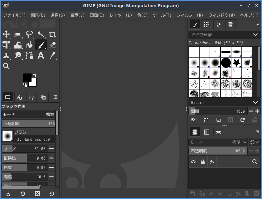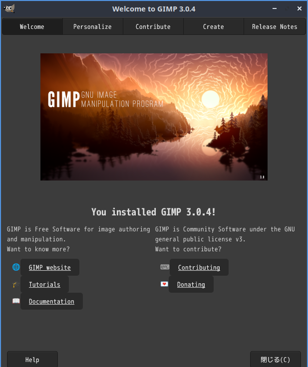 「閉じる」 起動直後の状態です。 2025年10月14日の時点で、下記のバージョンでした。 操作については、「画像編集ソフト GIMP2」に掲載しています。 上記は簡単なものですので、詳細なものがほしい方は、各所に初歩の手引きから応用編までありますので、そちらを参考にしてください。 |
