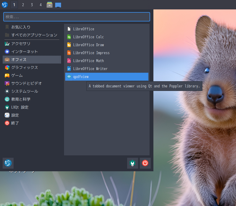 1. 概要 ドキュメントビューアとして、「qpdfview」を使用します。 「qpdfview」はデフォルトで、インストールされています。 2. 起動 「スタート」→「オフィス」→「qpdfview」