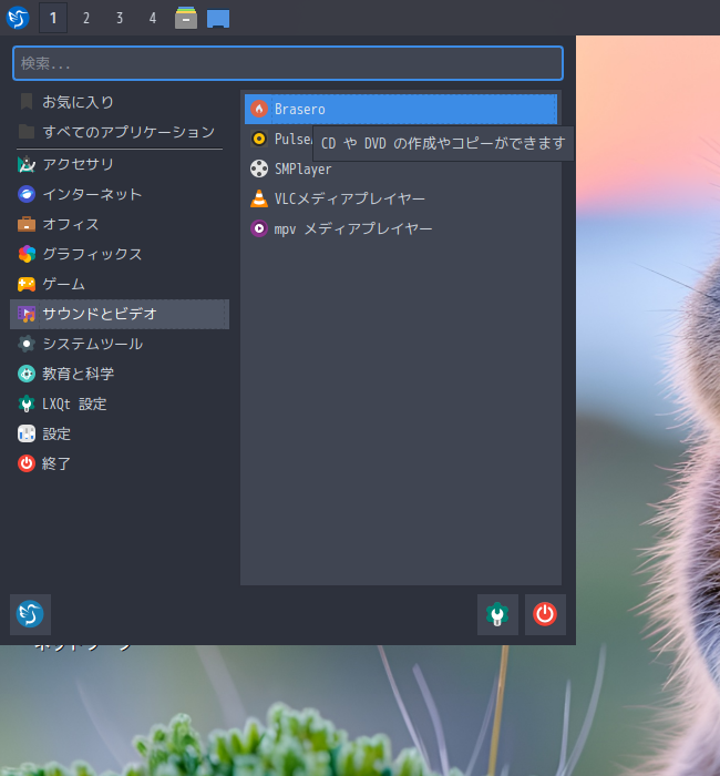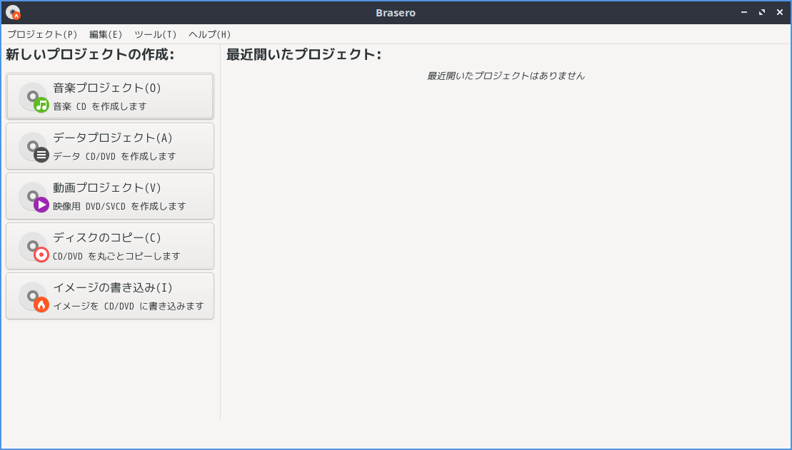 1. 概要 光ディスクのライティングソフトとして、「Brasero」を使用します。 2. インストール 「Discover」で、「brasero」を検索してインストールします。 3. 起動 「スタート」→「サウンドとビデオ」→「Brasero」