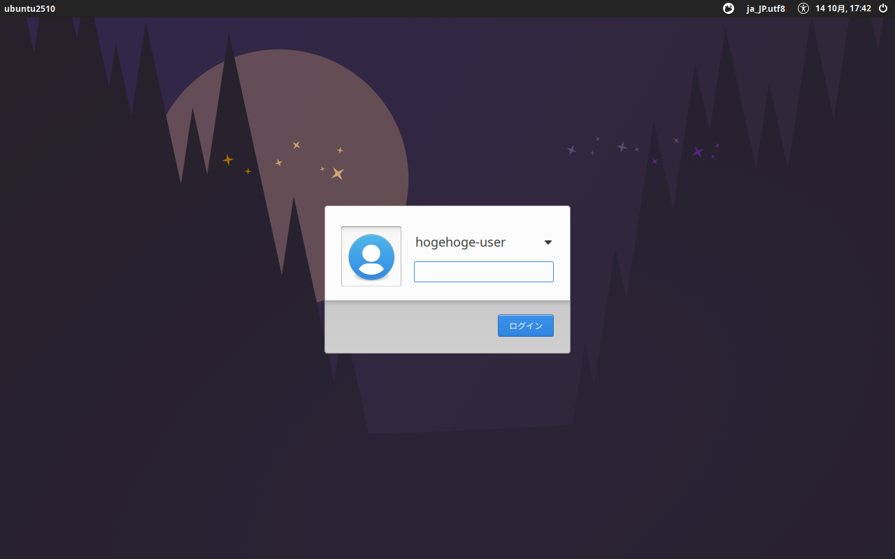 以降の手順は、「Linux - Ubuntu - 25.10 - 共通事項」と同様です。 ログイン画面が表示されれば、インストールは、完了です。