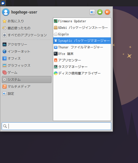 「スタート」→「システム」→「Synaptic パッケージマネージャ」
