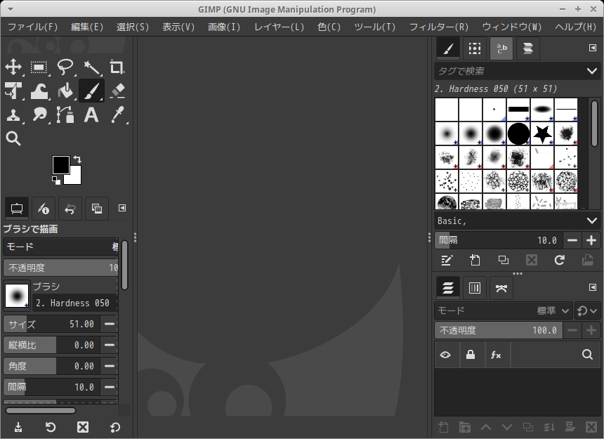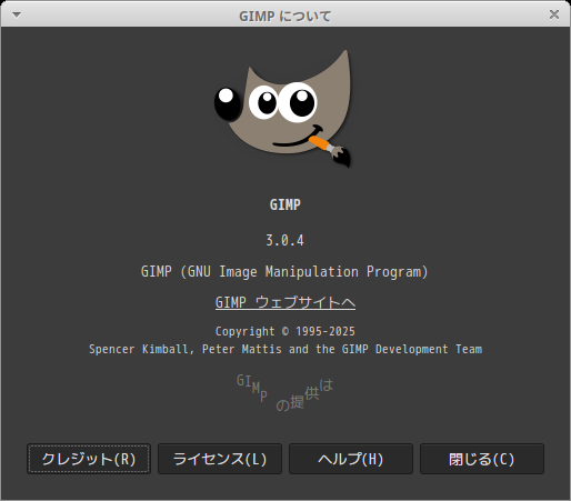「閉じる」 起動直後の状態です。 2025年10月15日の時点で、下記のバージョンでした。 操作については、「画像編集ソフト GIMP」に掲載しています。 上記は簡単なものですので、詳細なものがほしい方は、各所に初歩の手引きから応用編までありますので、そちらを参考にしてください。 |