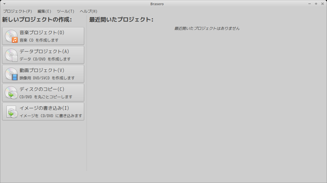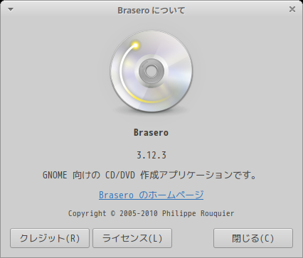 1. 概要 光ディスクのライティングソフトとして、「Brasero」を使用します。 「Xfburn」がインストールされていますが、そちらは、私には使いにくいので。 2. インストール 「Synaptic」で、「brasero」を検索して、インストールします。 3. 起動 「スタート」→「マルチメディア」→「Brasero」