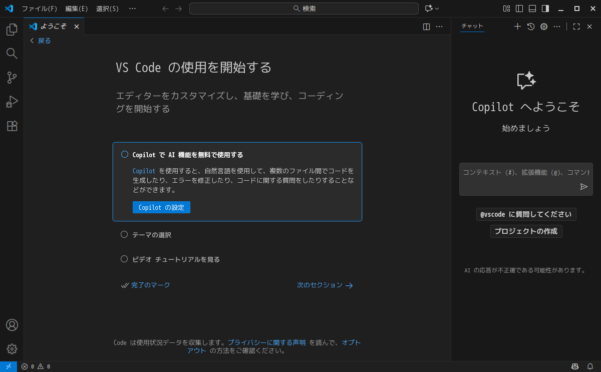 1. 概要 開発環境として、「Visual Studio Code」を使用します。 2. インストール 「アプリセンター」で、「vscode」を検索して、インストール(青いアイコンの方)します。 3. 起動 「スタート」→「開発」→「Visual Studio Code」