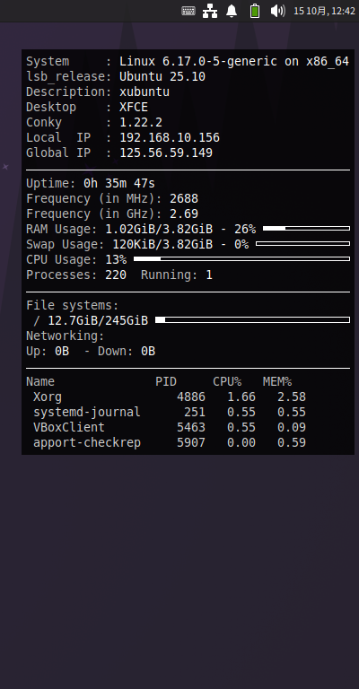 ログイン後に、デスクトップ右に、「Conky」の表示が現れます。