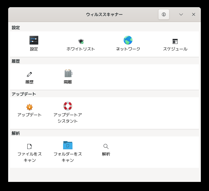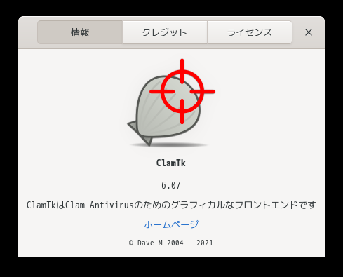 起動直後の状態です。 2025年10月15日の時点で、下記のバージョンでした。 操作方法については、「FreeBSD」のものですが「FreeBSD - デスクトップ環境構築 - 共通事項 - ClamTk」をご参照ください。 |