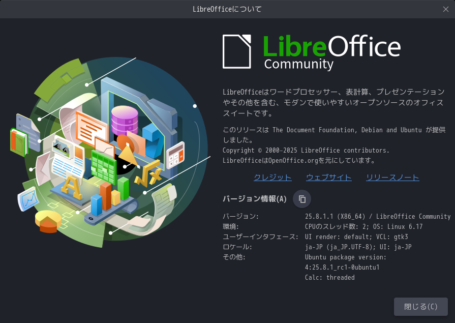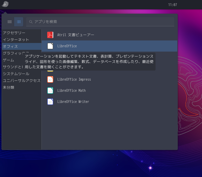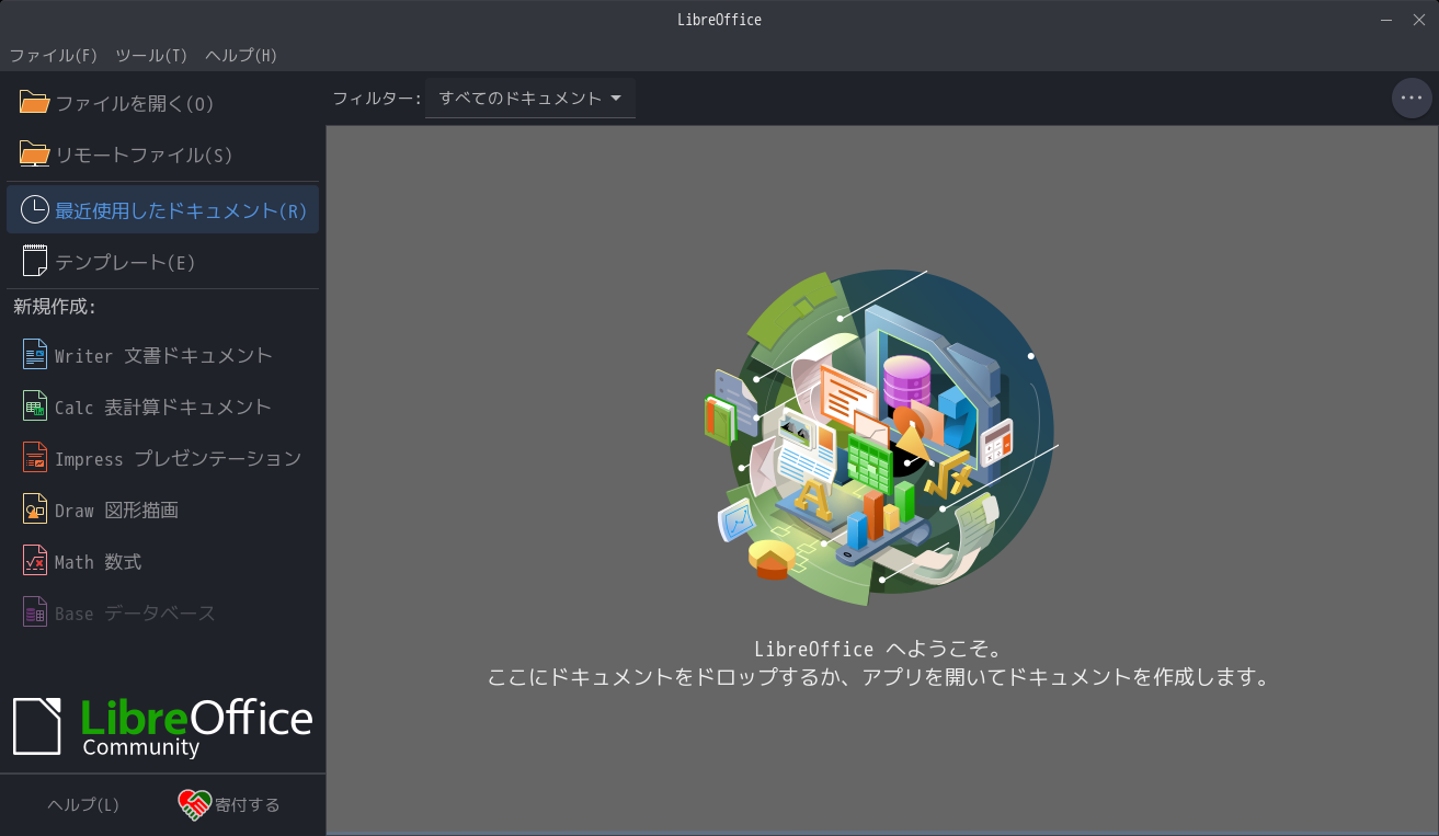 1. 概要 オフィススイートとして、「LibreOffice」を使用します。 「LibreOffice」は、デフォルトでインストールされており、日本語化されています。 2. 起動 「スタート」→「オフィス」→「LibreOffice」