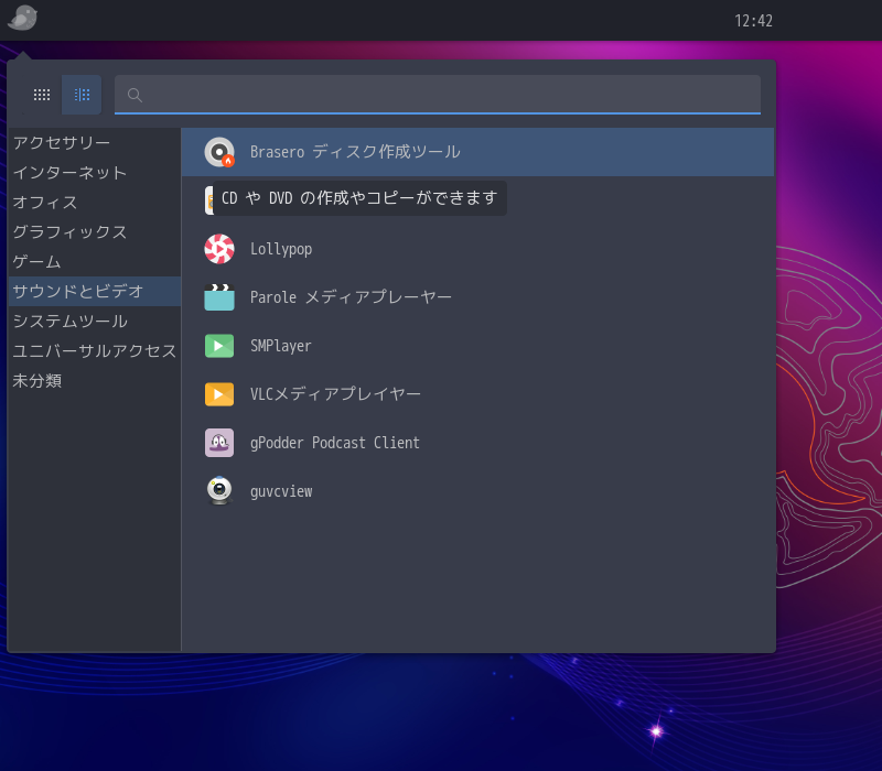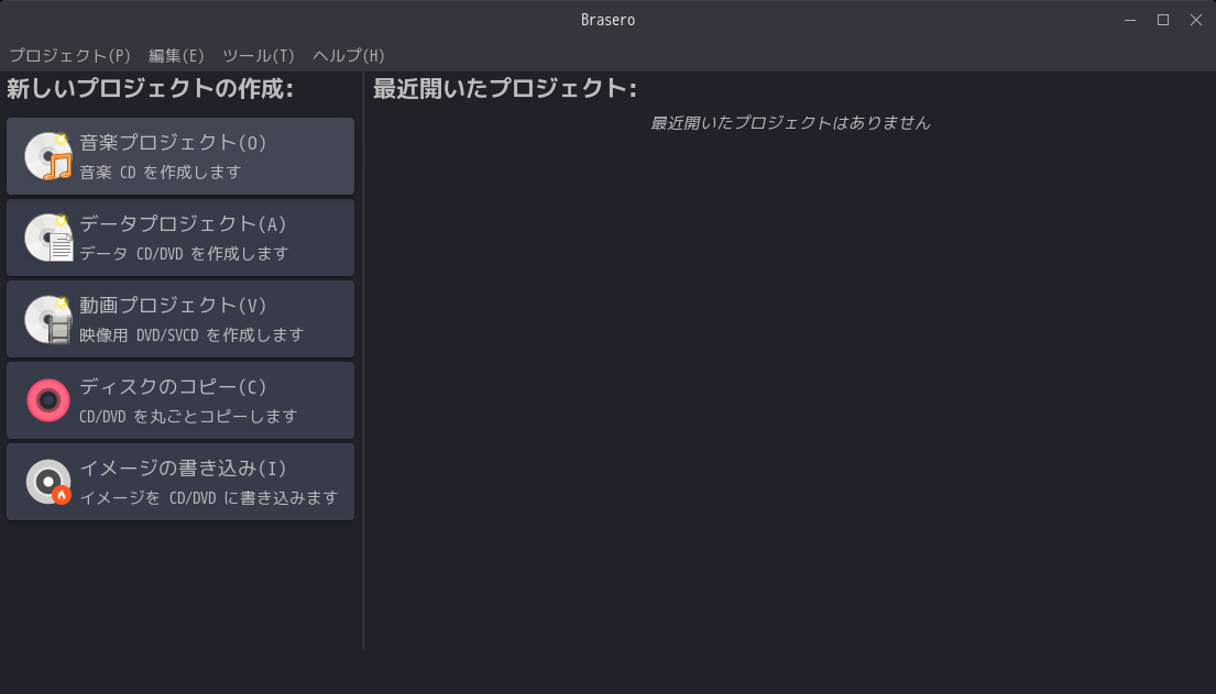 1. 概要 光ディスクのライティングソフトとして「Brasero」を使用します。 2. インストール 「Synaptic」で、「brasero」を検索して、インストールします。 3. 起動 「スタート」→「サウンドとビデオ」→「Brasero」