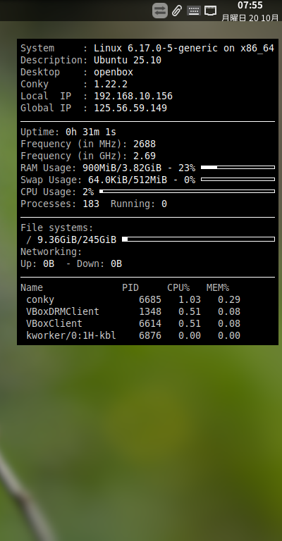 再ログイン後に、デスクトップ右に、「Conky」の表示が現れます。