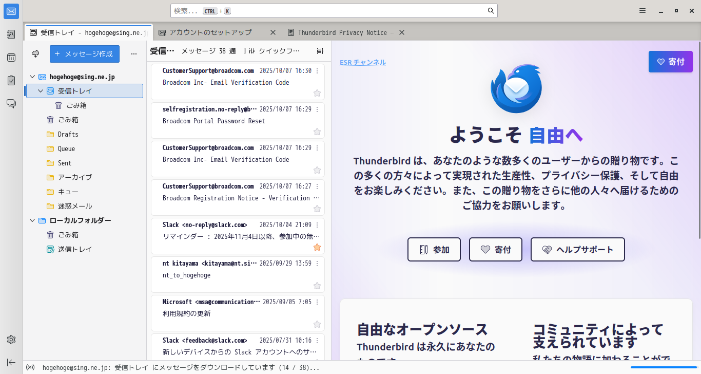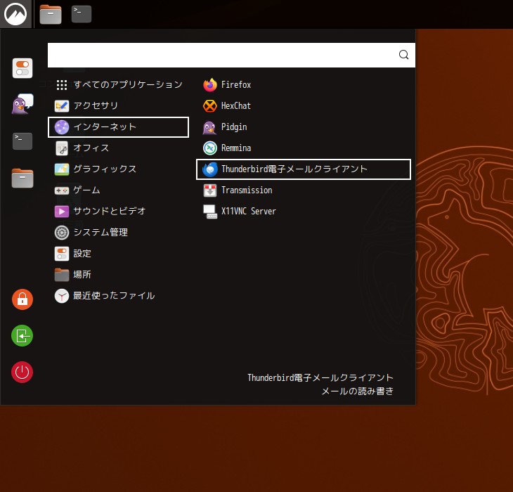 1. 概要 メールクライアントとして、「Thunderbird」がインストールされ、日本語化されています。 「Thunderbird」の「アカウントセットアップ」その他に関しては、「メールクライアント - Thunderbird」をご参照ください。 2. 起動 「スタート」→「インターネット」→「Thunderbird」