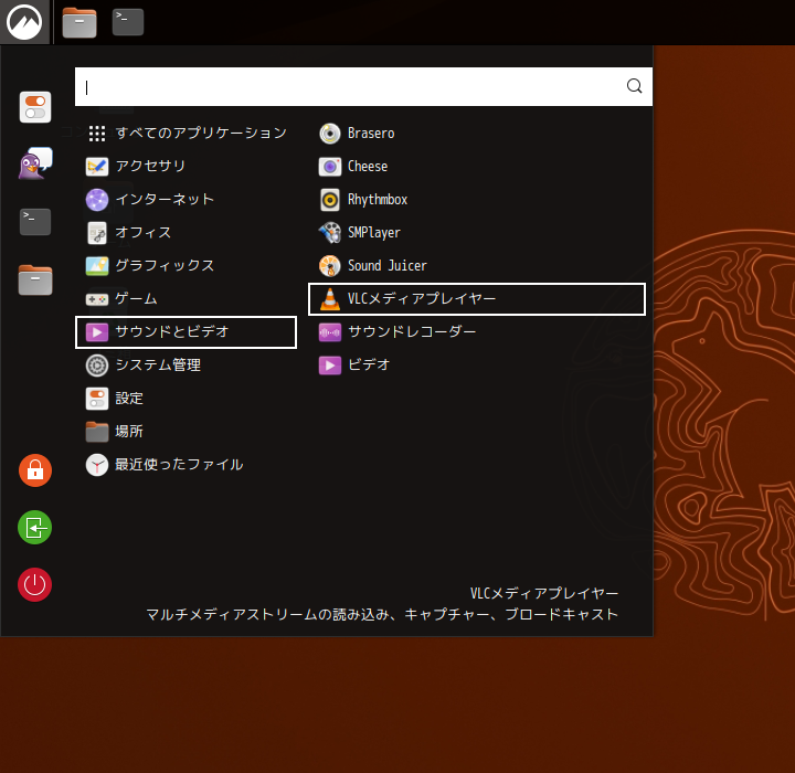 「スタート」→「サウンドとビデオ」→「VLC メディアプレイヤー」